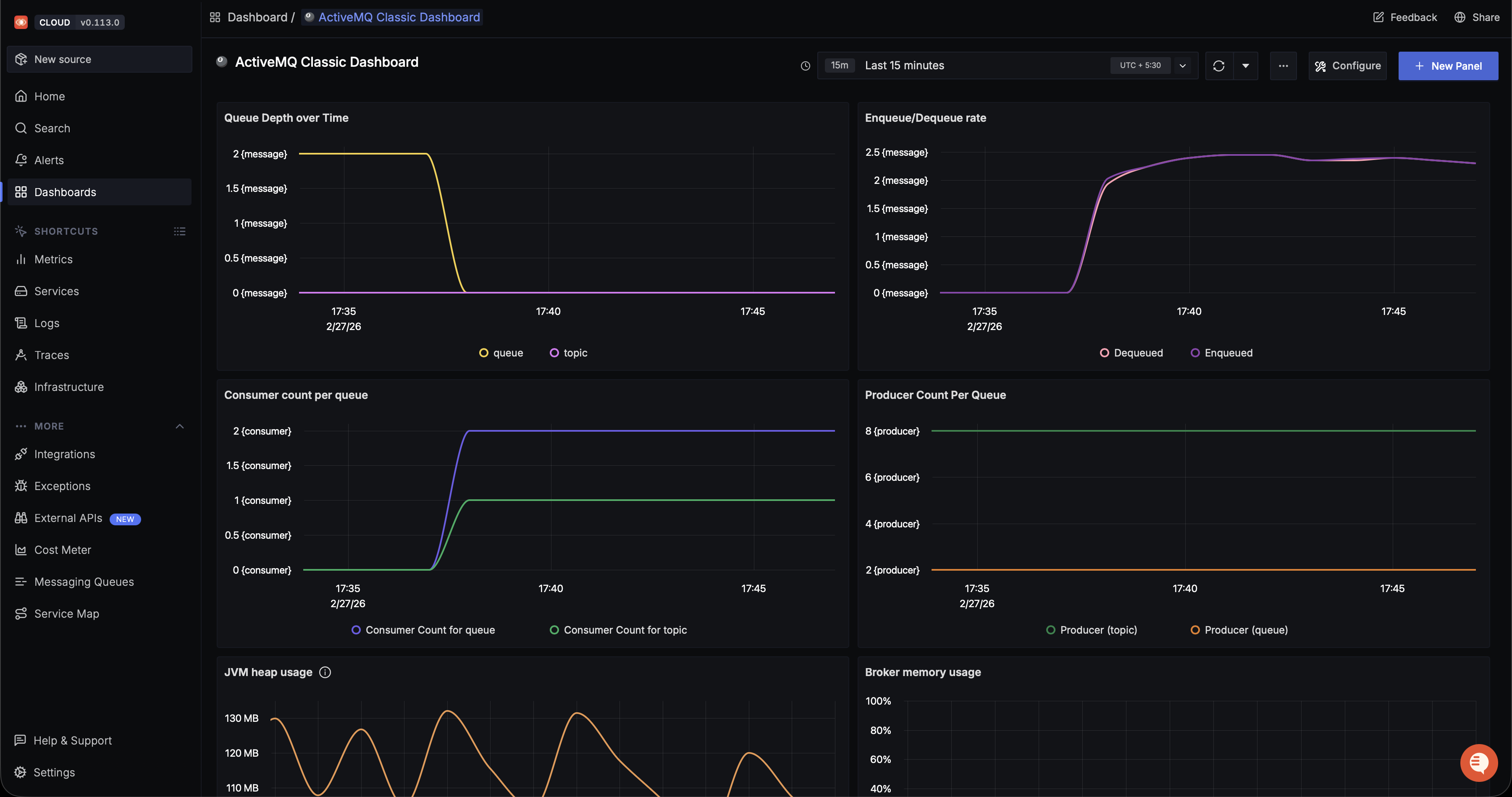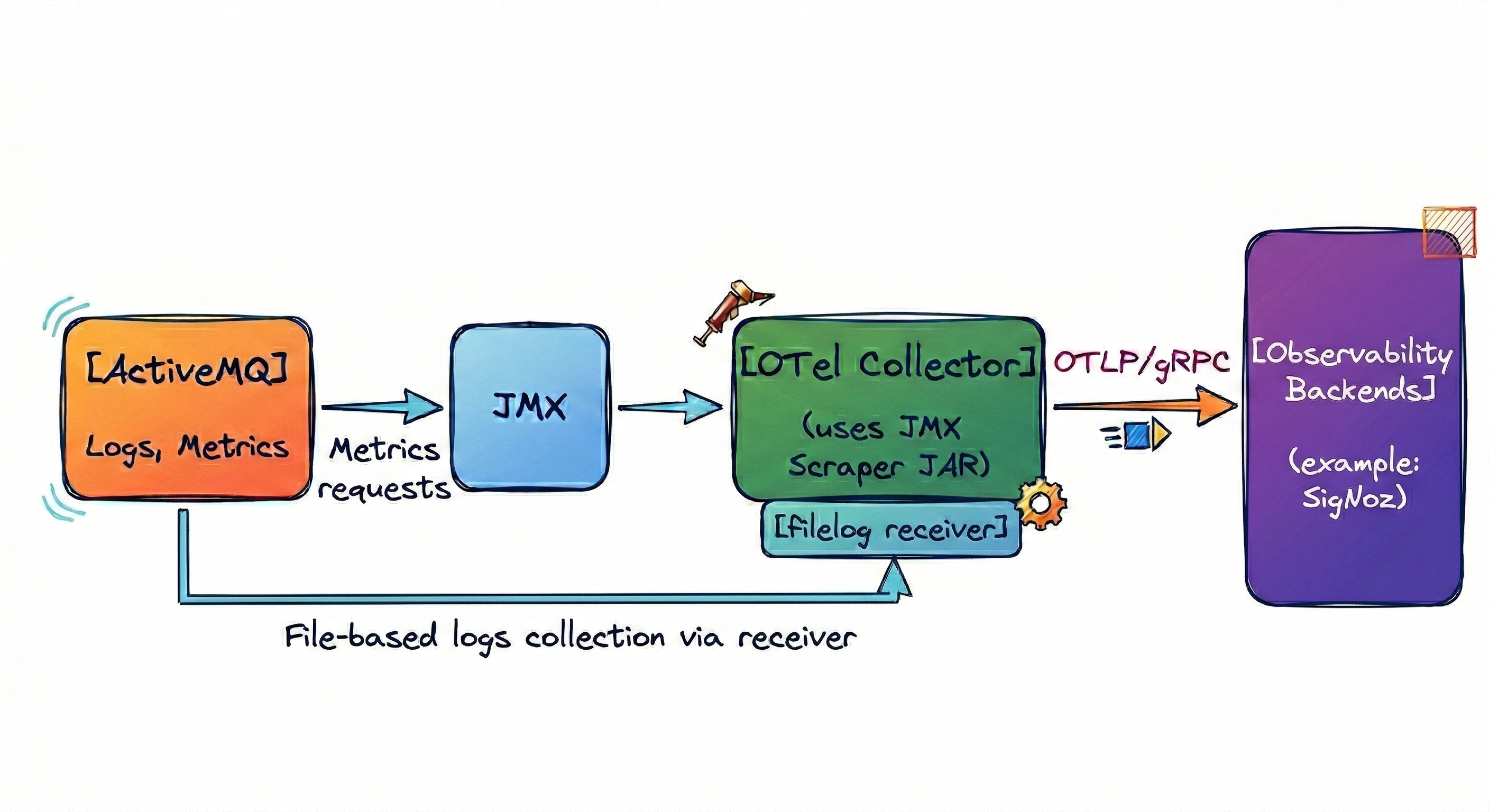 This guide covers the steps to set up end-to-end monitoring of ActiveMQ, including collecting broker, queue, and JVM metrics with the OpenTelemetry Collector's JMX receiver, forwarding logs, building dashboards for broker and queue health, and configuring alerts for common failure modes.