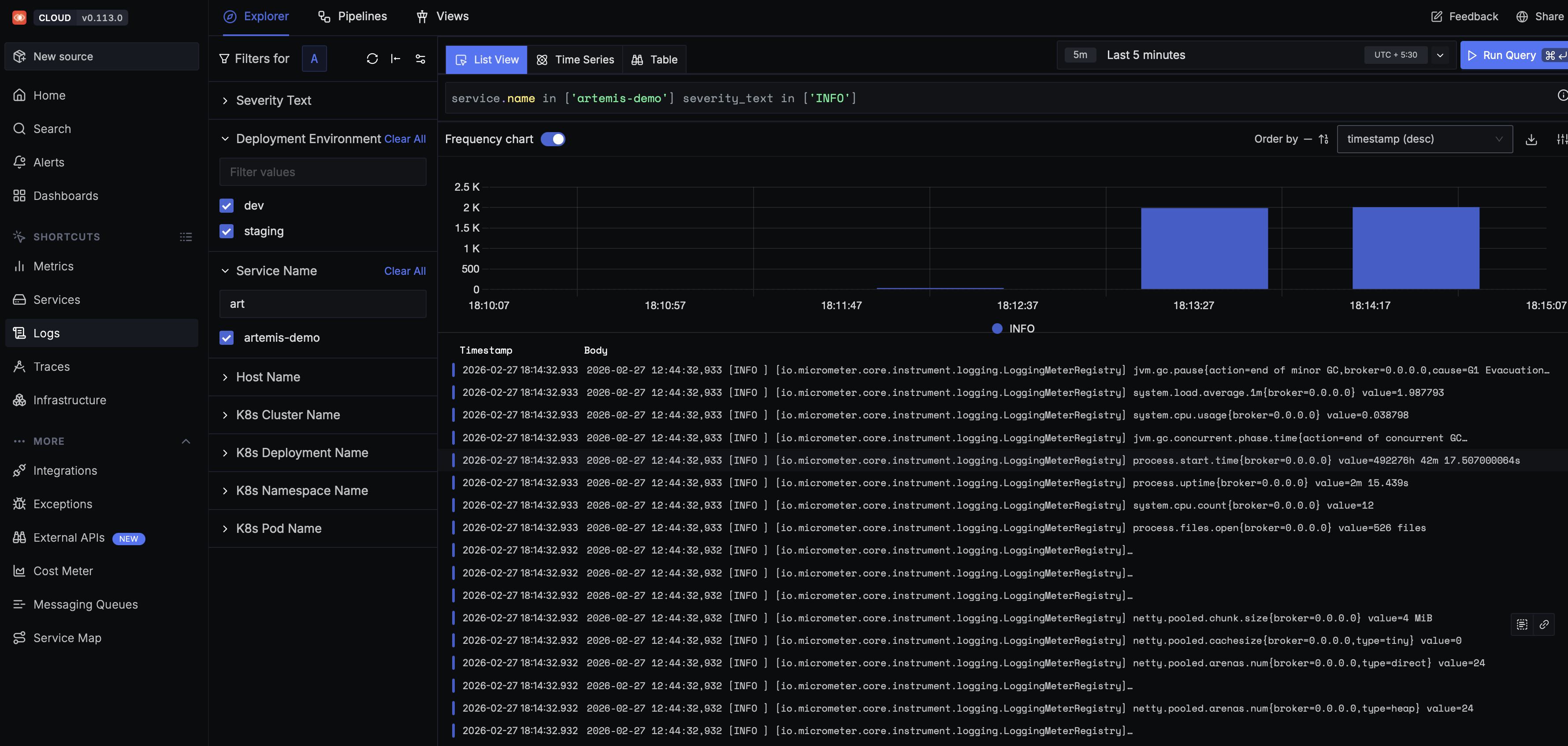 Go to Logs → Explorer in SigNoz and filter by service.name = activemq-classic-demo or service.name = artemis-demo. Narrowing further with severity = ERROR or severity = WARN helps surface problems quickly.