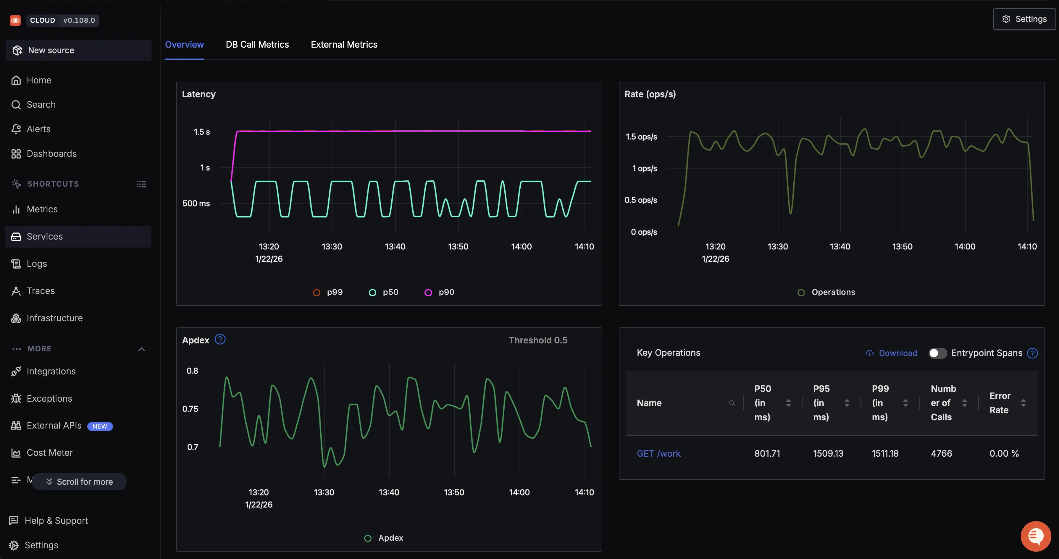 SigNoz Cloud service dashboard illustrating latency trends, throughput, and the resulting Apdex score To improve accuracy, look for the
