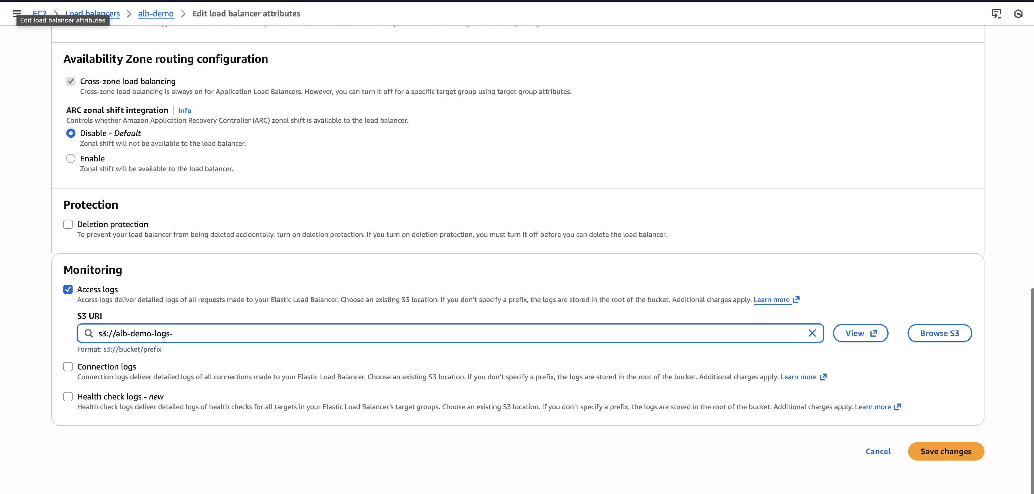 Open the EC2 Console and navigate to Load Balancers. Select your Application Load Balancer, go to the Attributes tab, and click Edit. Toggle Access logs to Enabled, enter your S3 bucket name, and click Save changes.