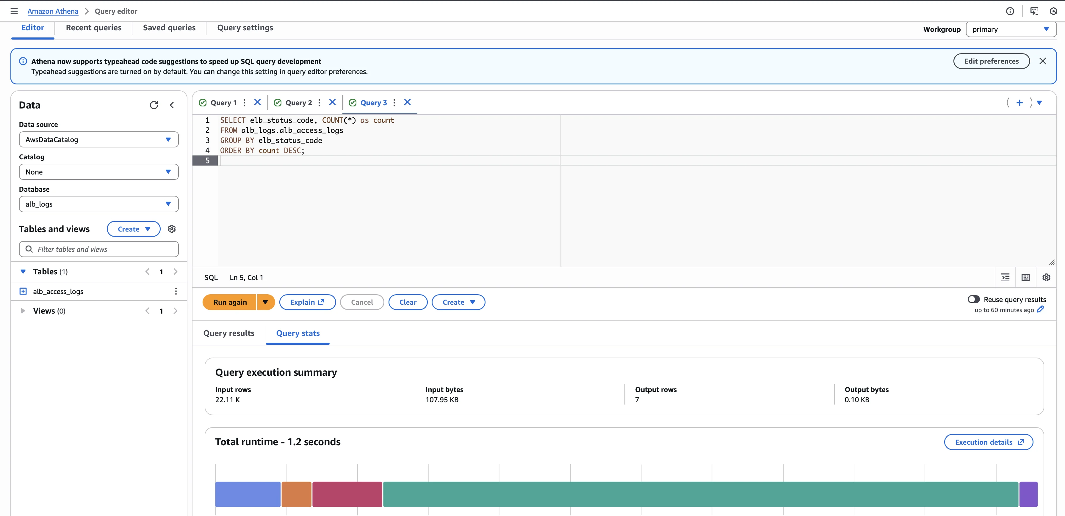 Now you can run SQL queries. Here is a sample troubleshooting query to find the distribution of HTTP status codes: