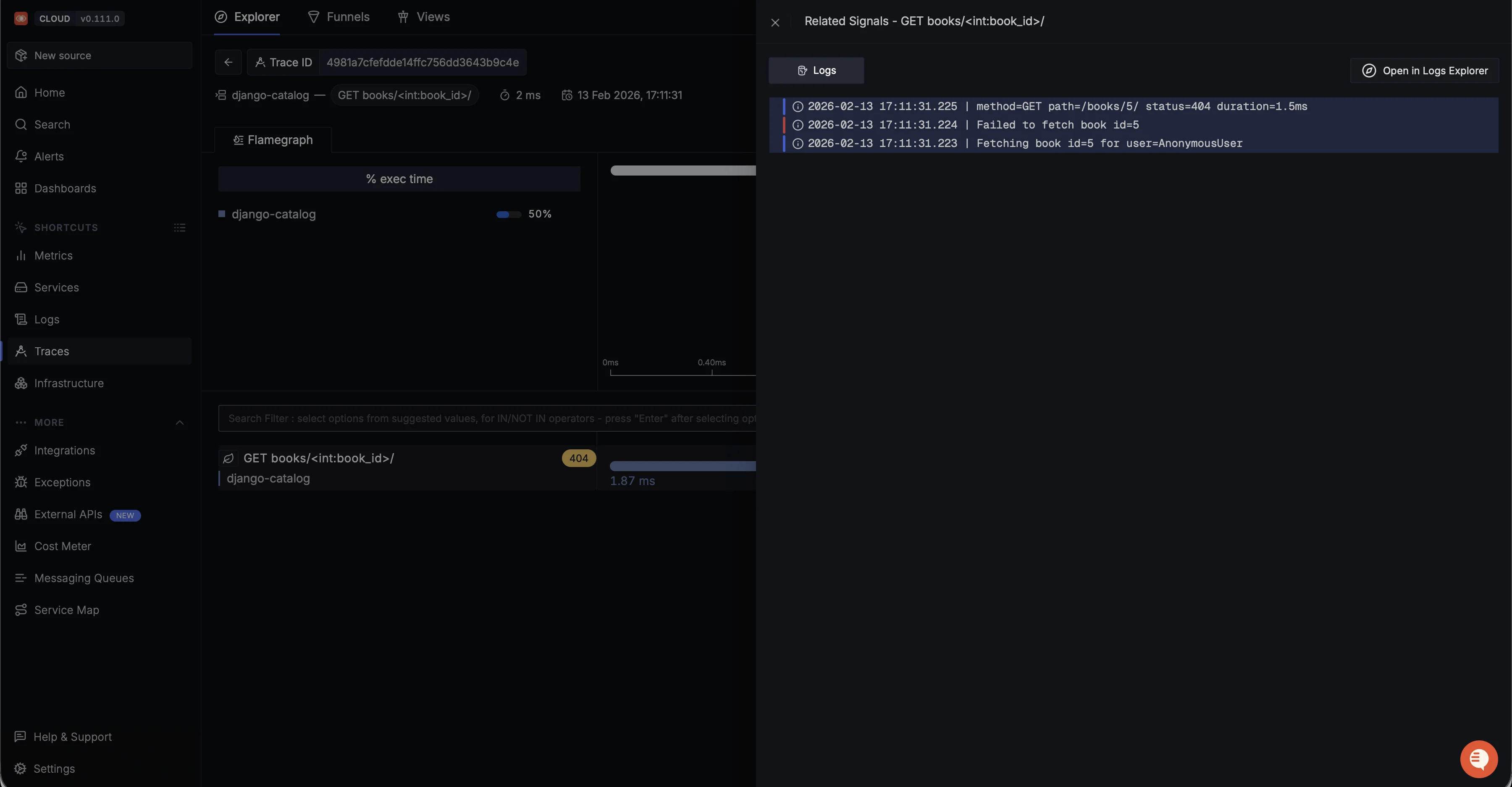 Now, click the Logs button under "Related Signals" in the span details panel. This opens a side panel that shows all log entries emitted during that specific trace. In our case, you'll see three logs tied to the /books/5/ request: the initial Fetching book id=5 INFO entry, the Failed to fetch book id=5 ERROR, and the middleware's method=GET path=/books/5/ status=404 duration=1.5ms line.