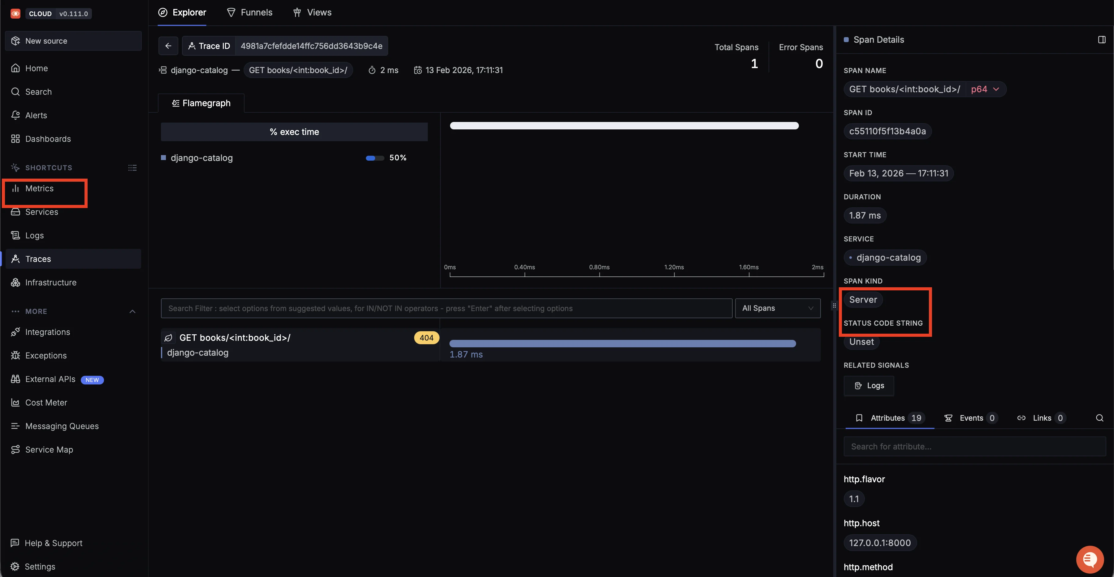 To see this in action, switch to the Traces tab in the left sidebar. Find one of the GET books/<int:book_id>/ traces and click on it. The trace detail page shows a flamegraph with the span timeline. On the right-side panel, you'll see the span details including the span ID, start time, duration, service name, and span kind.