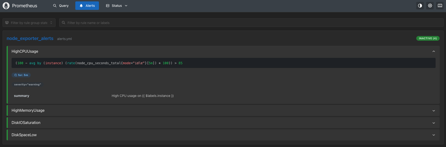 - alert: HighCPUUsage