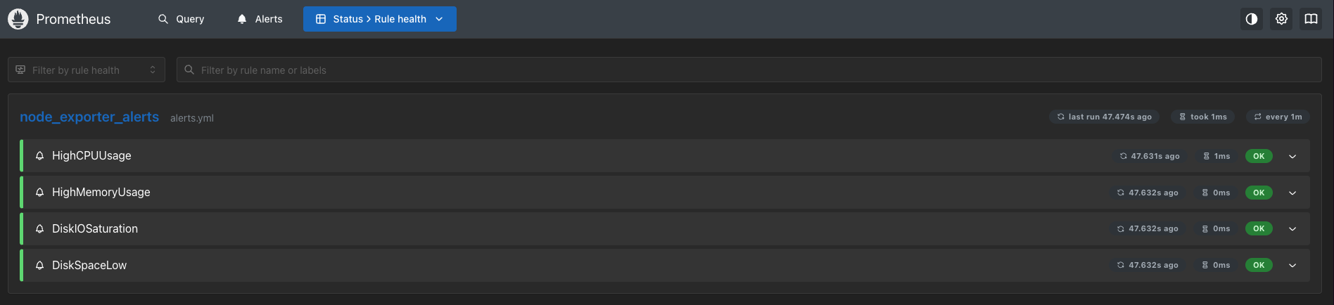 Once Prometheus is running, you can verify that your scrape targets and alert rules are correctly loaded by opening the Prometheus UI in your browser.