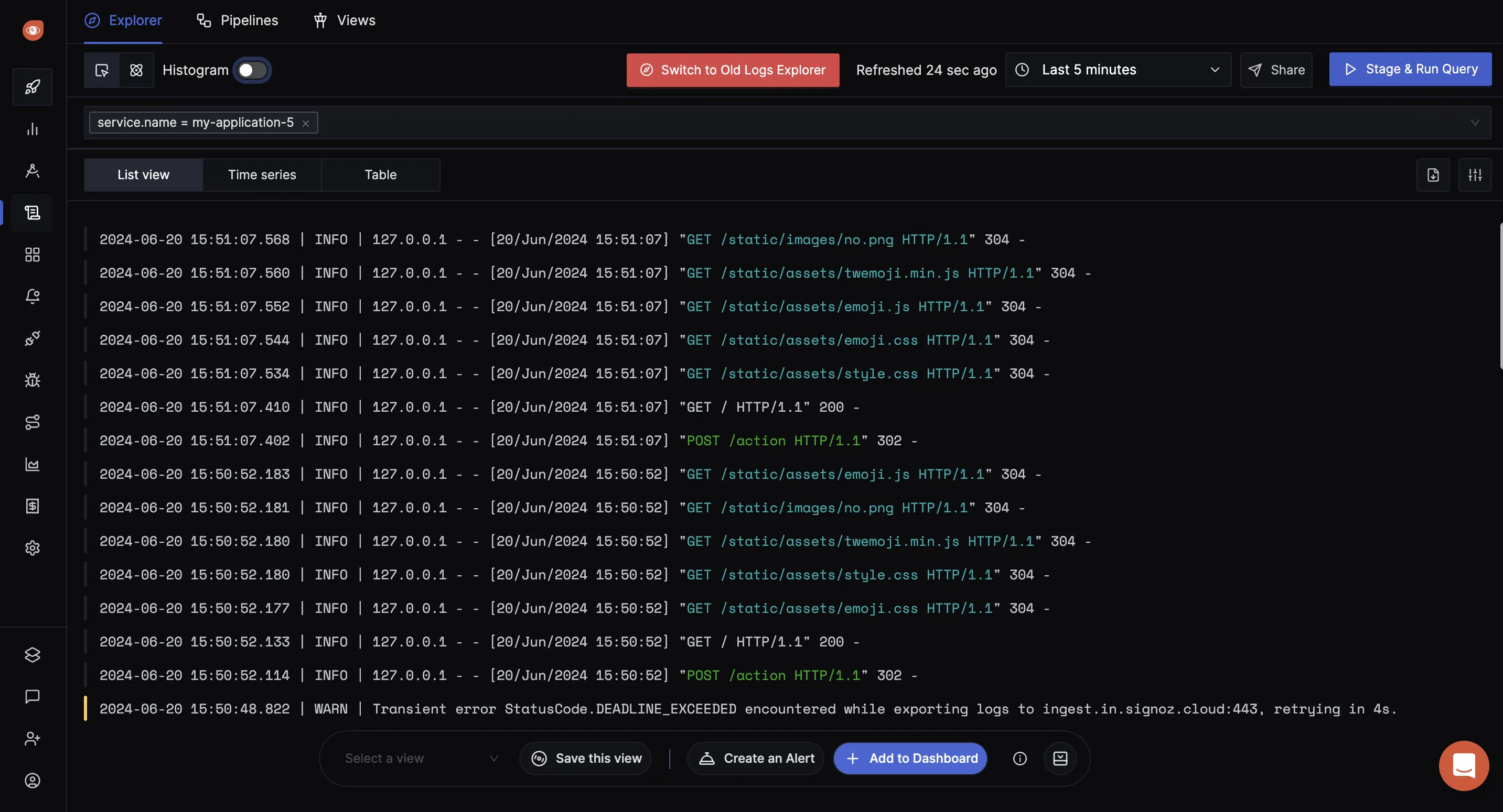 Go to Logs tab of SigNoz and apply filter for your Flask application service. You will be able to see the logs coming from your application.