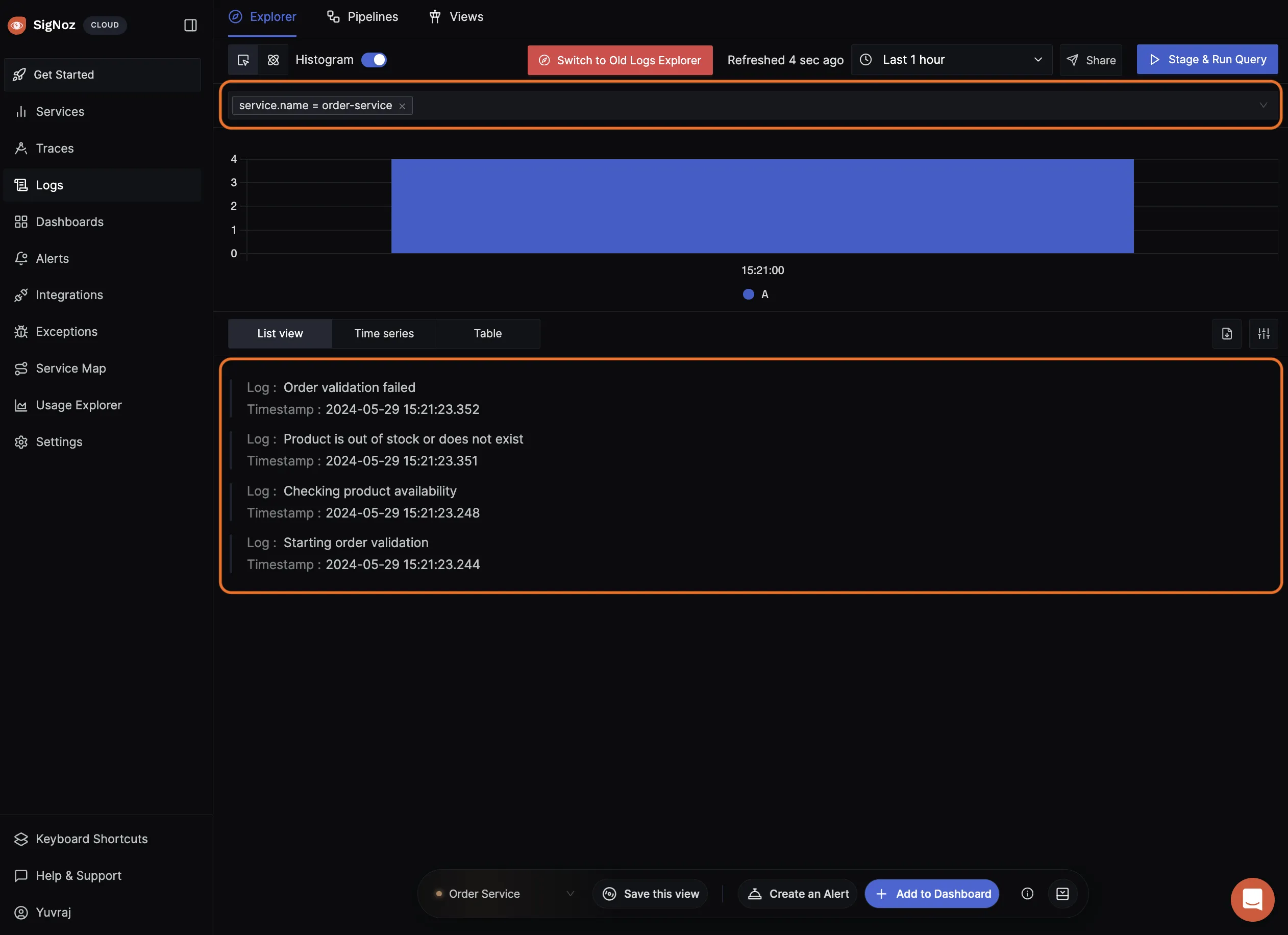 Run the services and hit the post request on the order-service endpoint and then navigate to the logs dashboard to see all the logs being set to SigNoz.