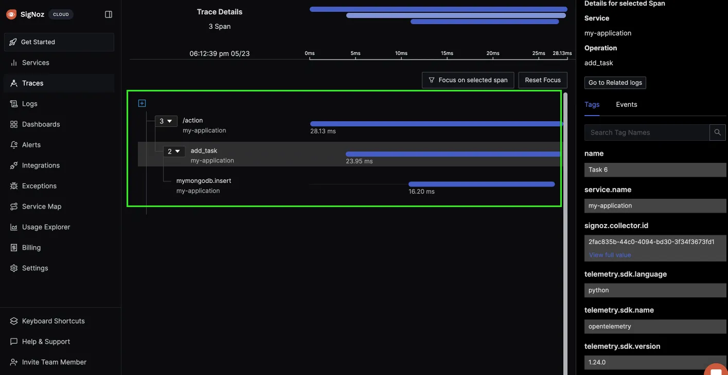 Once you run the application and add a task, you will be able to see it in SigNoz.