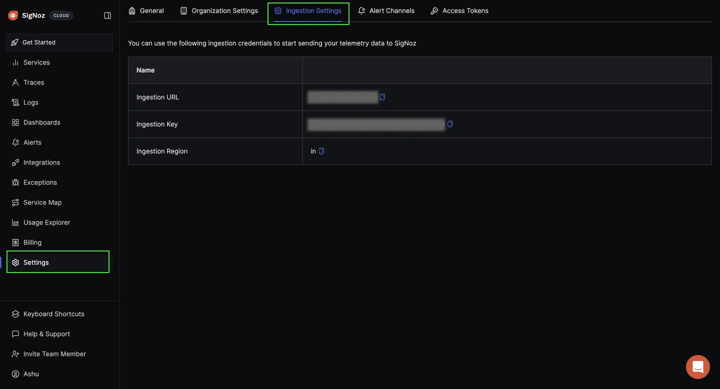 For sending data to SigNoz cloud, you will be needing details like ingestion key and region. You can find them under Ingestion Settings under Settings.