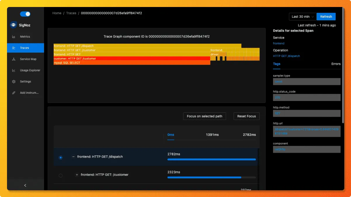 SigNoz comes with out of box RED metrics charts and visualization. RED metrics stands for: