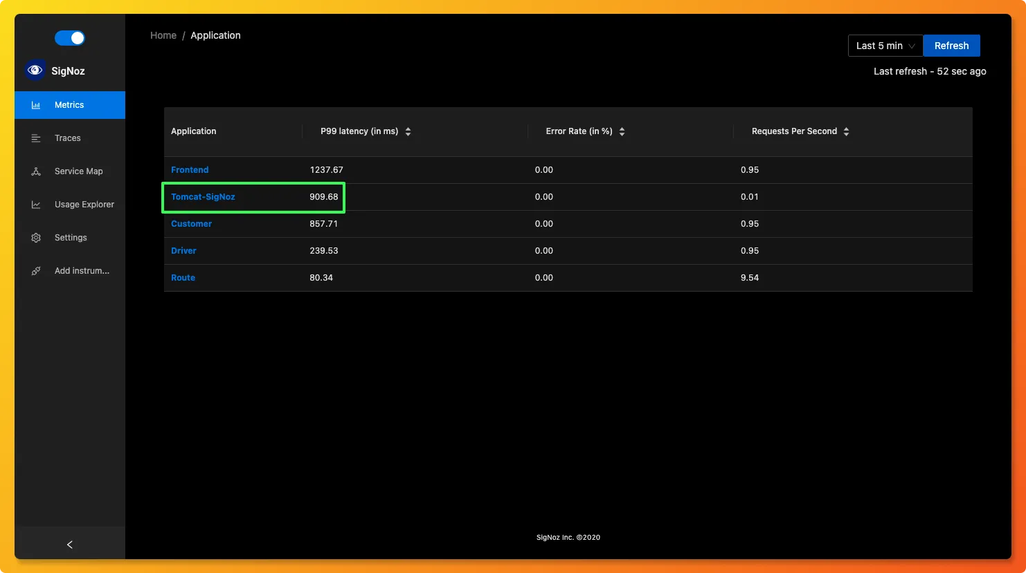 Tomcat-SigNozapp in the list of applications being monitored.