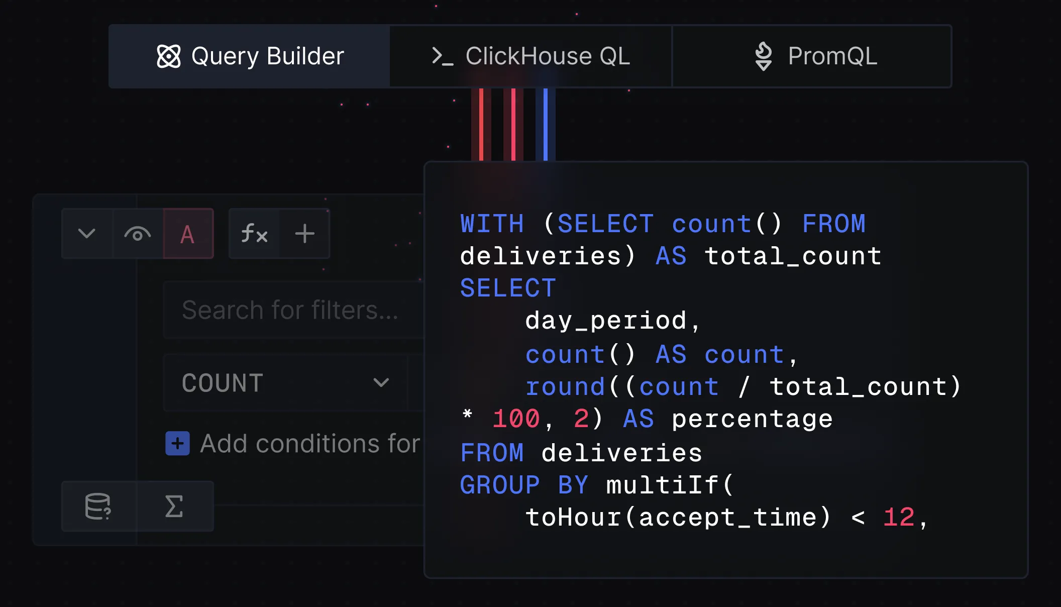 DIY Query builder, PromQL, and ClickHouse queries to fulfill all your use-cases around querying observability data.