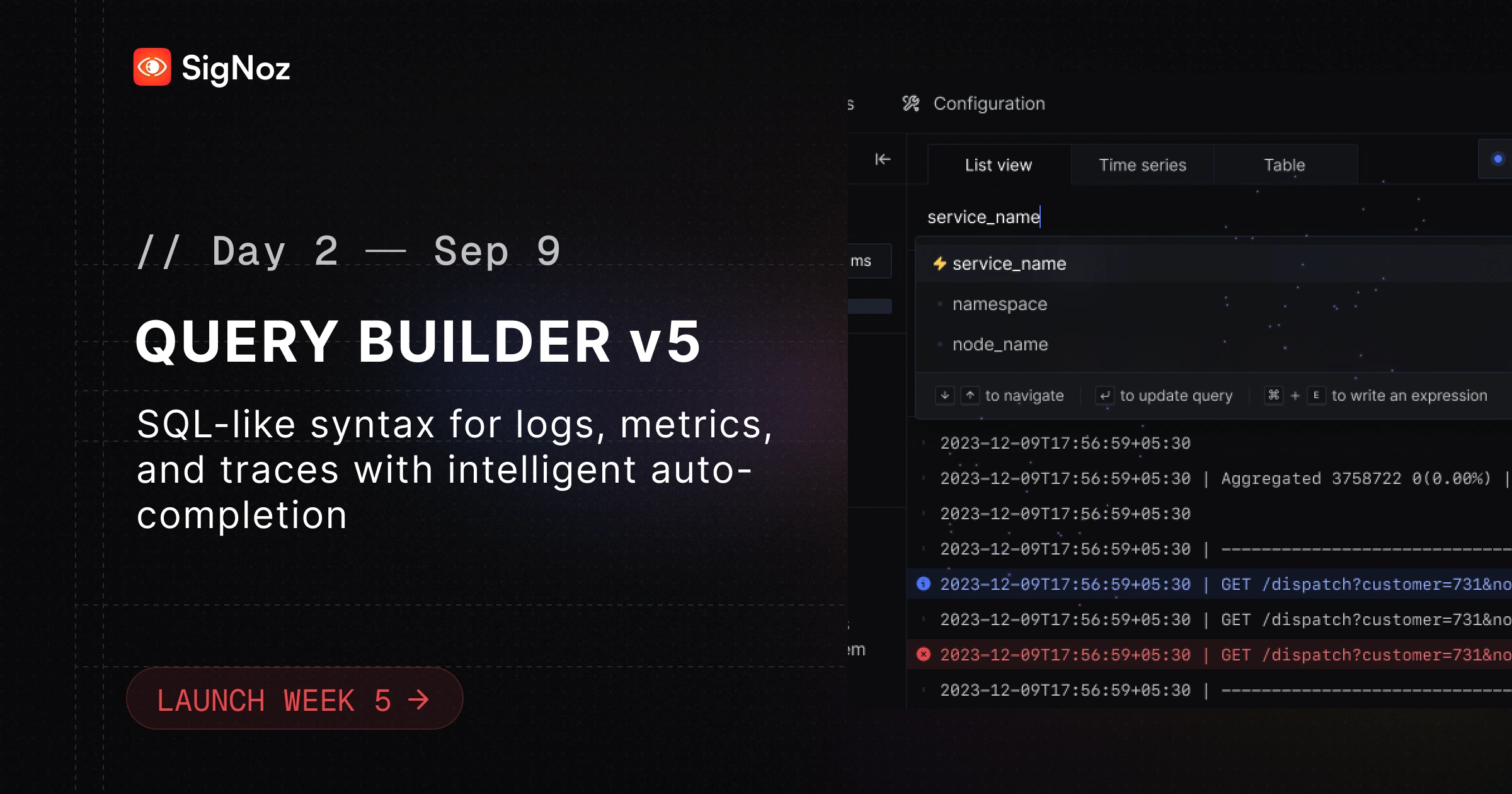 v5 brings familiar SQL-like syntax to observability data with expression-based querying that works across logs, metrics, and traces. Write complex queries using the syntax you already know.